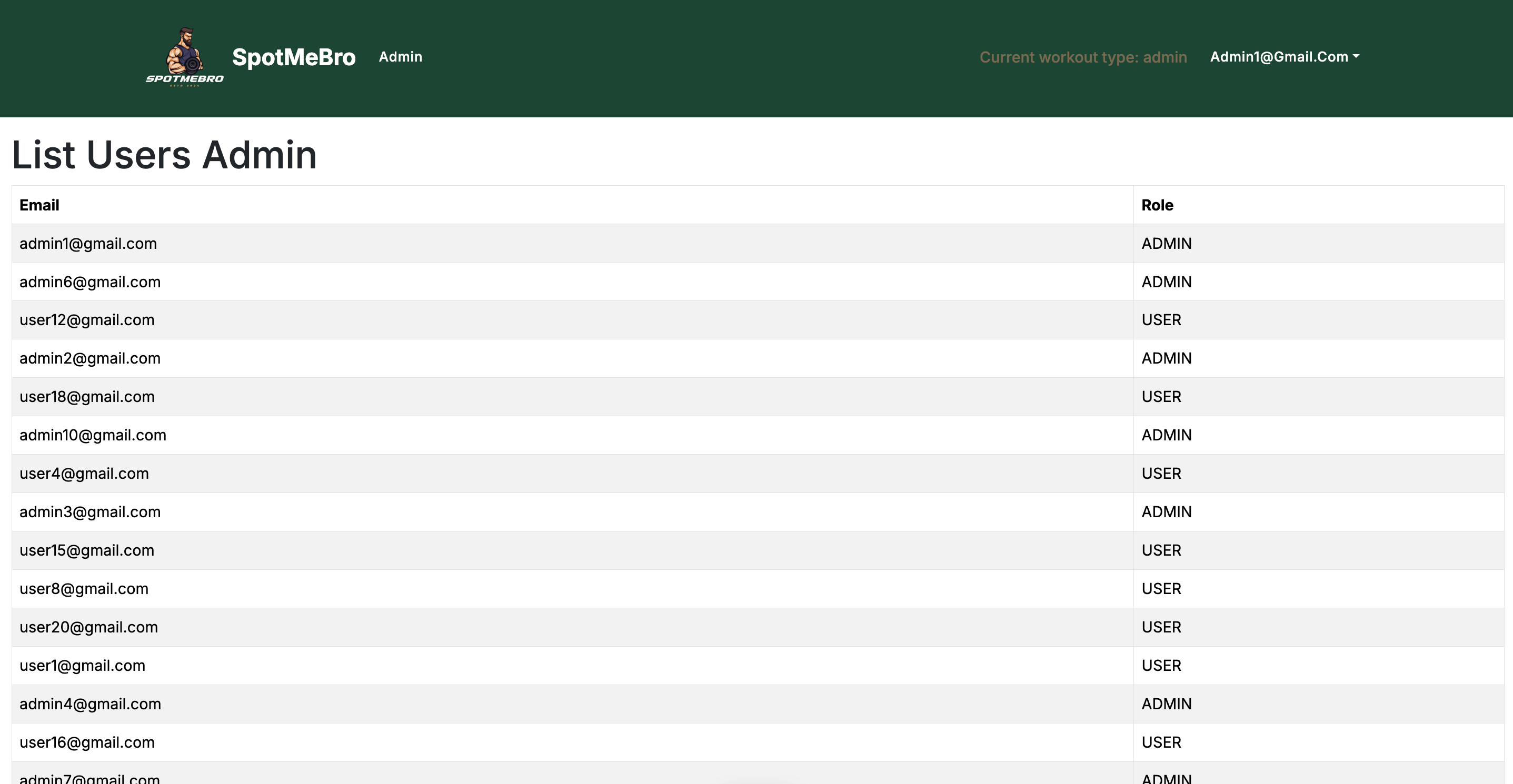 Admin page. This page is only accessible when logged in as an admin user. Admins can view/edit all user profiles and workouts.