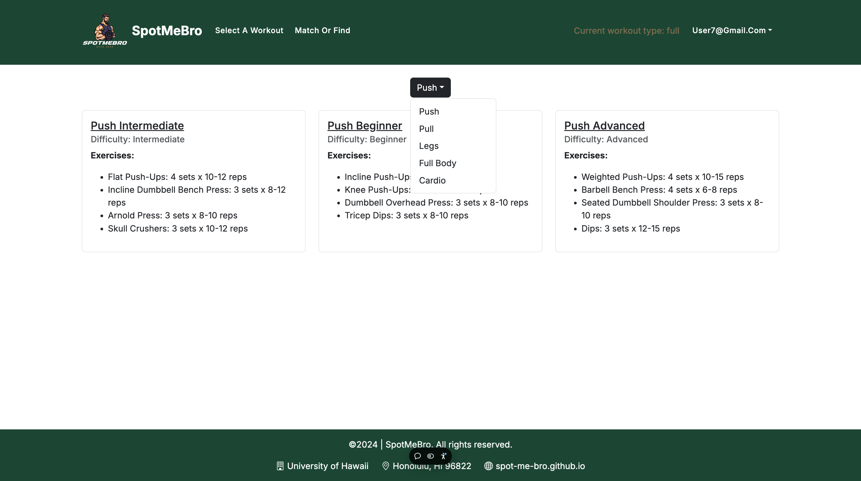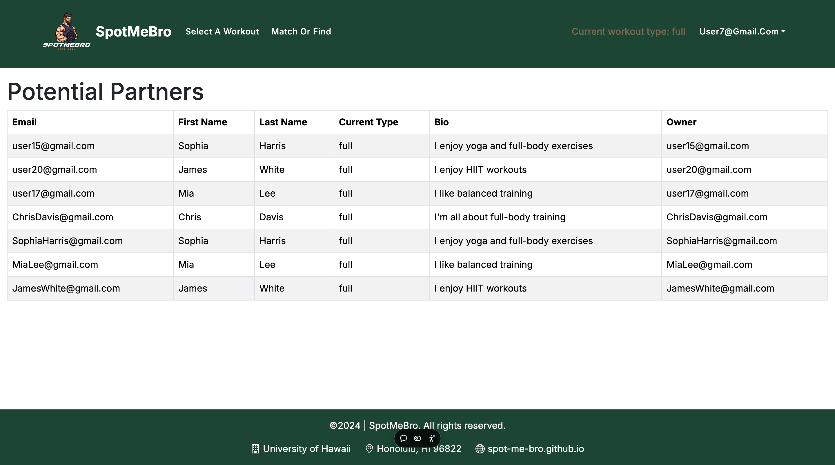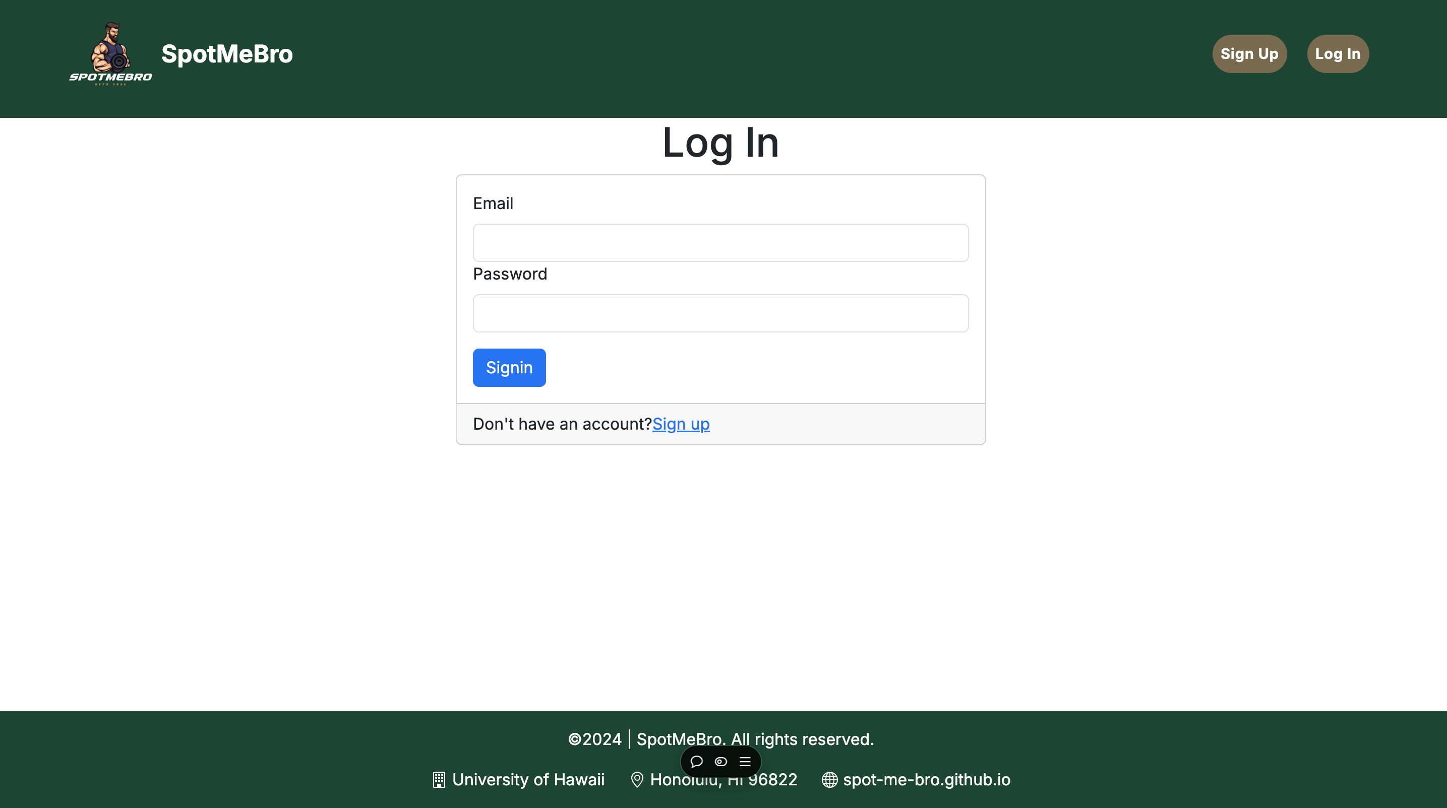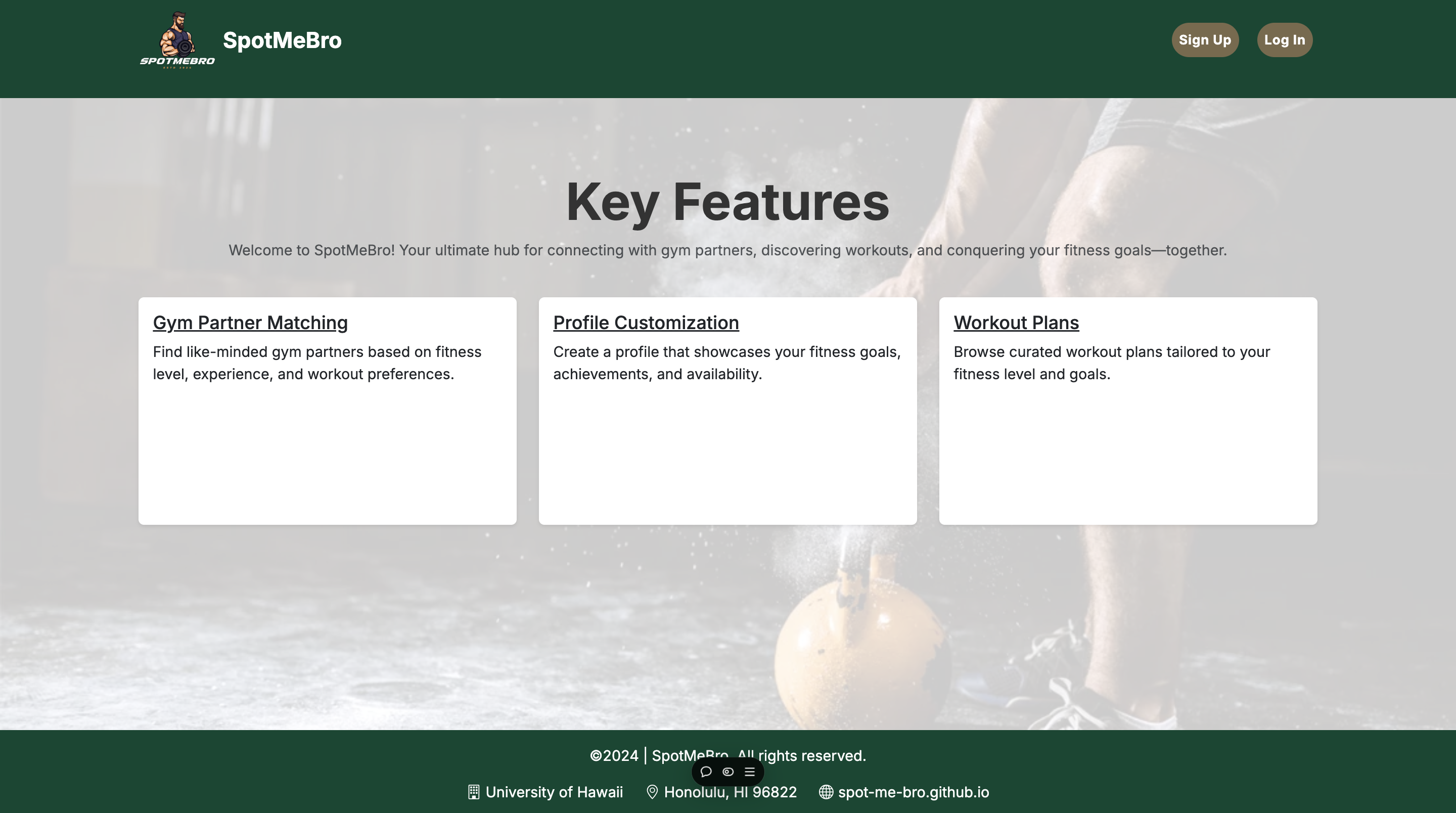 To make sure SpotMeBro is as user-friendly and effective as possible, we had 5 community members try out the app and share their feedback. Overall, the responses were pretty positive, with most users saying they liked the clean design and simple navigation. Many found the “Find a Partner” feature to be the most useful, as it allowed them to quickly connect with gym partners who had similar workout goals. Some users suggested adding more customization options profile details and also having hyperlinks in the workouts page so users could learn more about the workouts that were listed. We also received feedback that the sign-up process could be more flexible, as the requirement for a @hawaii.edu email could be seen as a limitation. Based on this feedback, we plan to improve performance, add more customization options, and explore ways to make the sign-up process more inclusive but also safe. Overall, the feedback confirmed that SpotMeBro has potential, and the suggested improvements will make it even better.