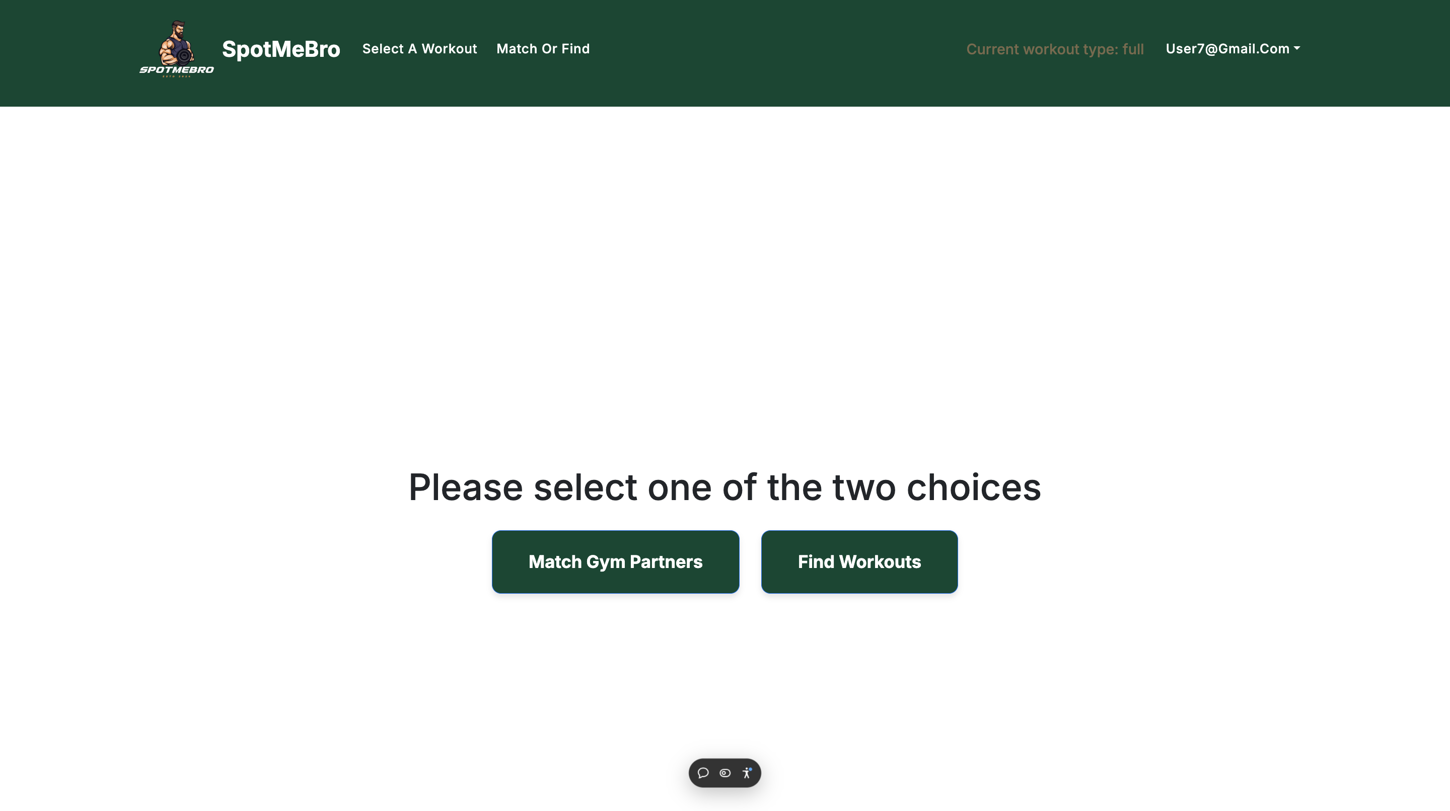 Match or Find page. Users can be matched with potential gym partners by clicking the “Match Gym Partners” button or can browse potential workouts by clicking the “Find Workouts” button.