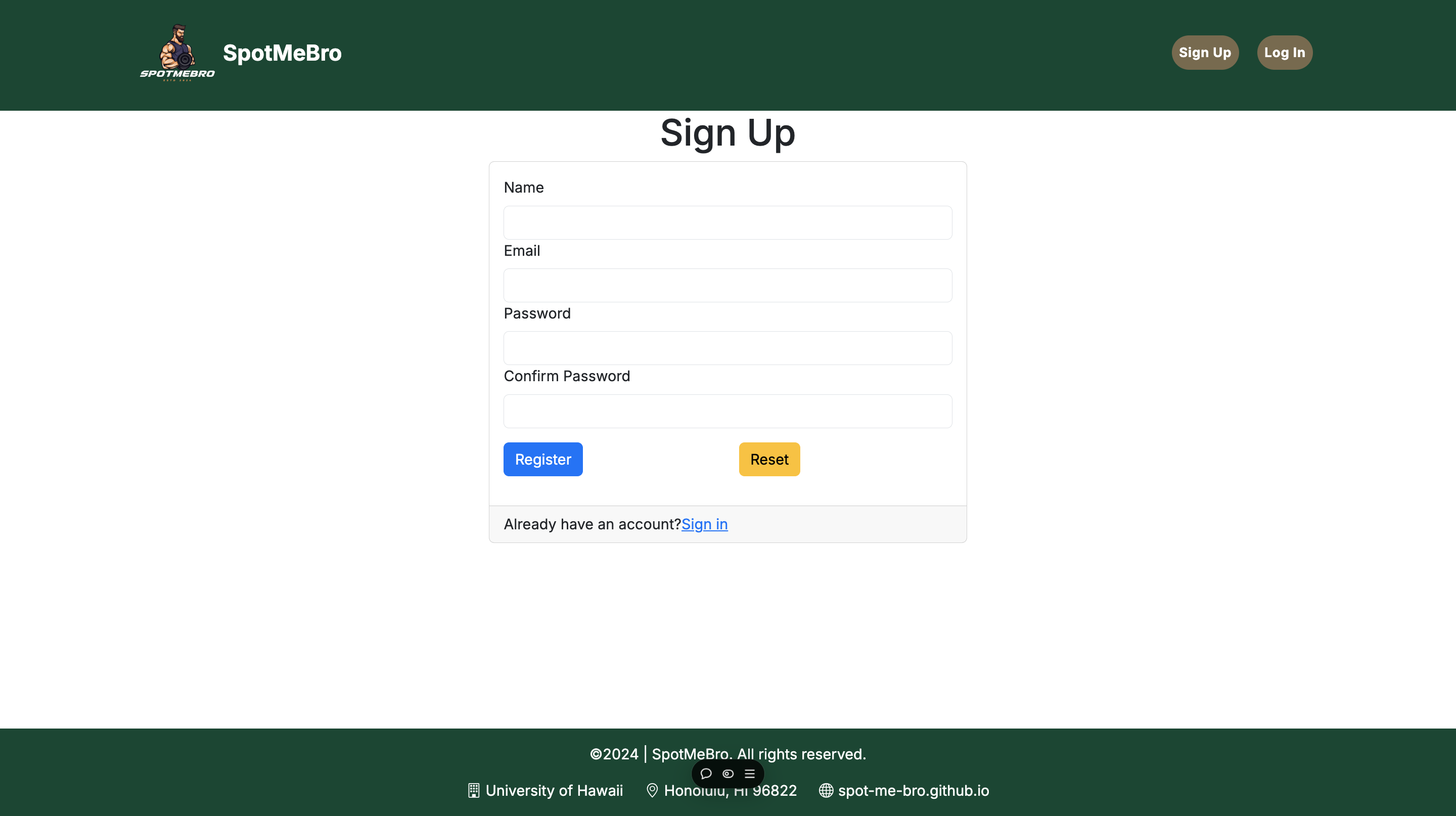 Sign Up page. Users can make an account. Users must sign up with a registered @hawaii.edu email.